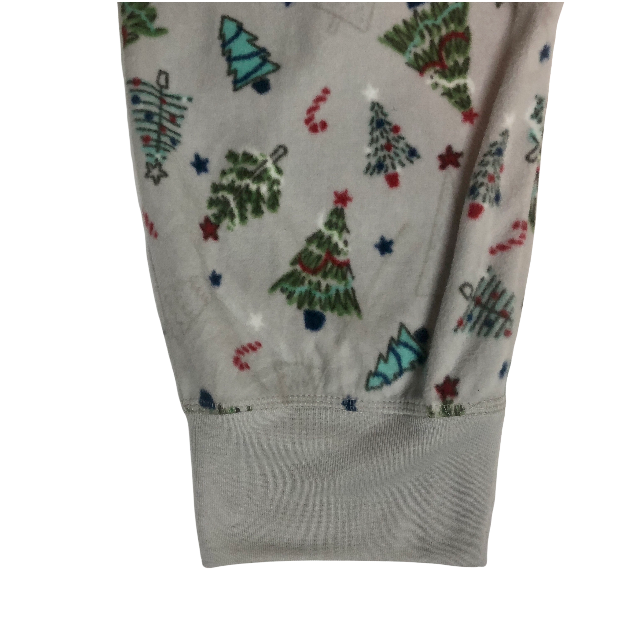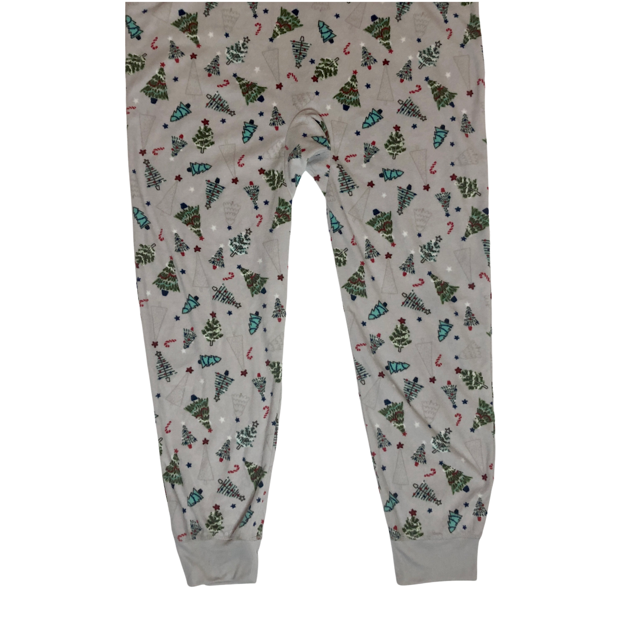 - All over print of decorated Christmas trees, stars, and candy canes