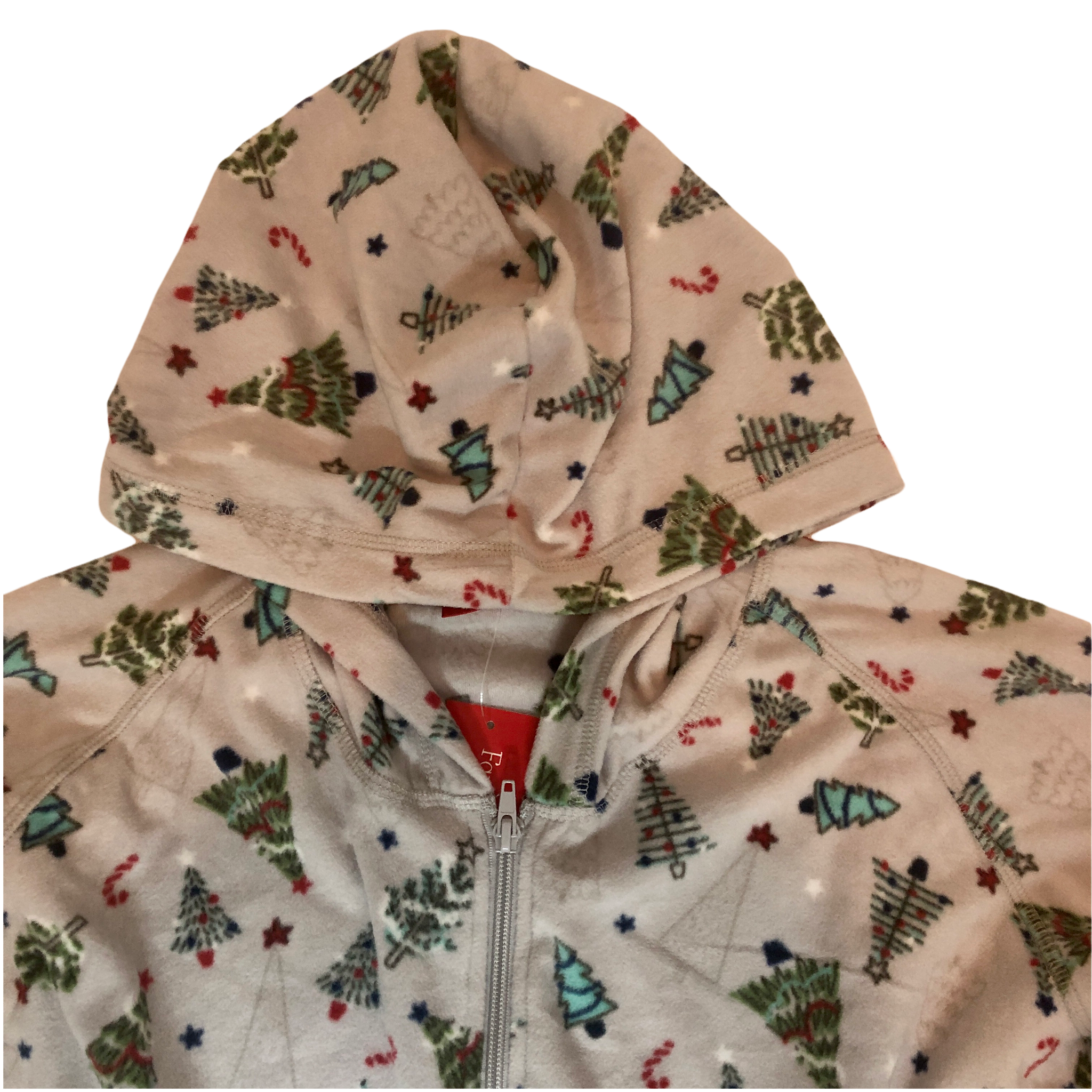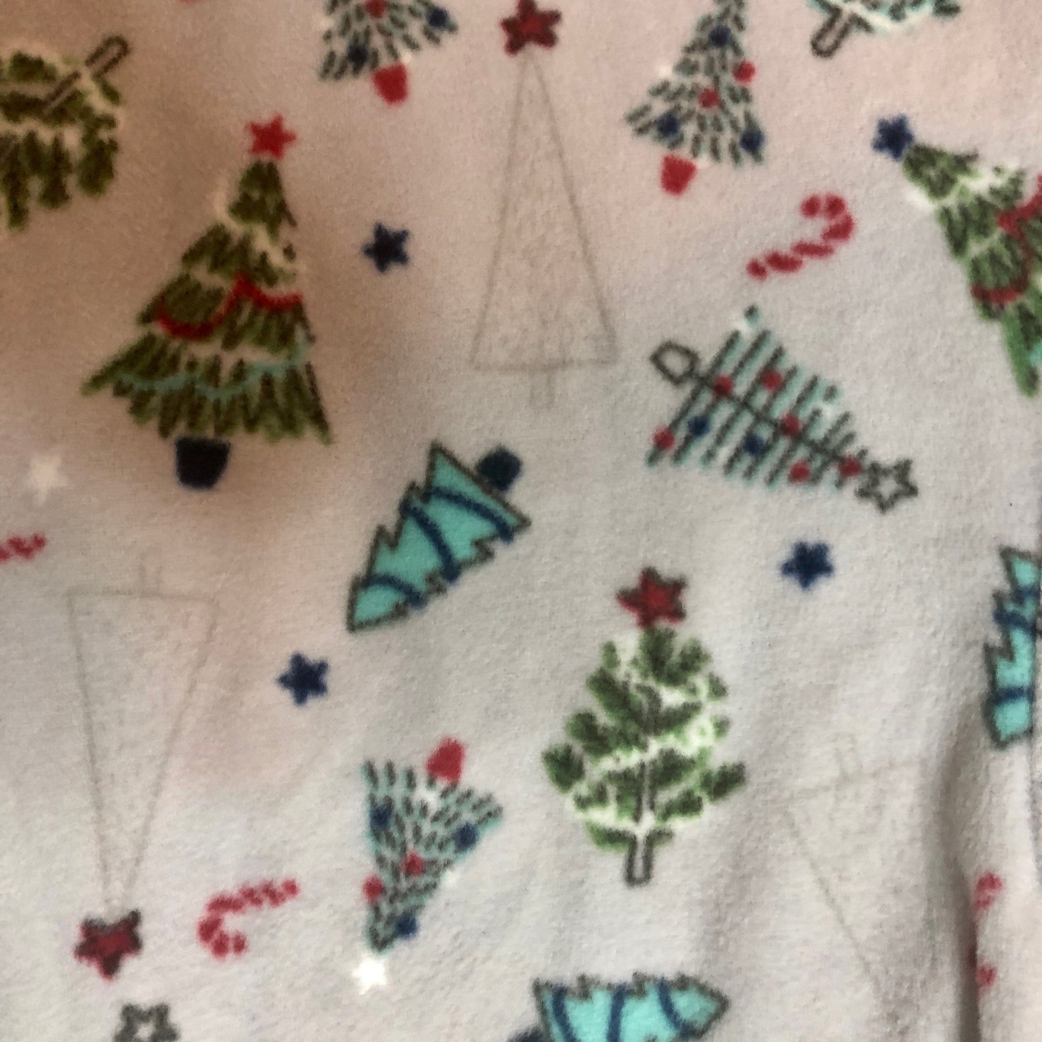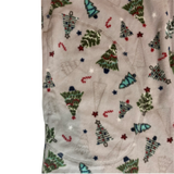 - All over print of decorated Christmas trees, stars, and candy canes
