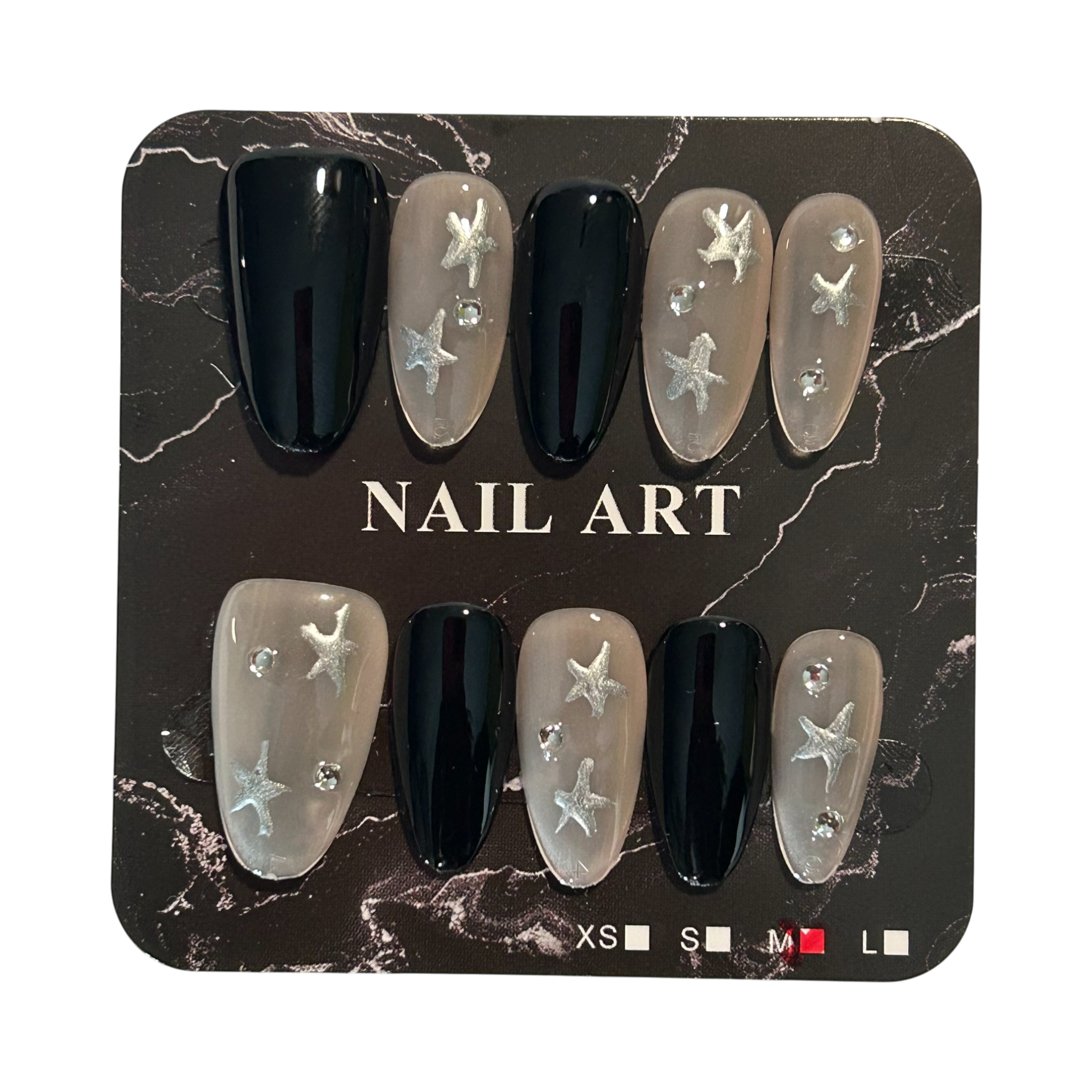 Black and Translucent Pink Star Medium Almond Press On Nails - Size Medium