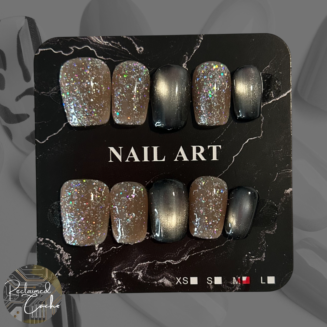 Champagne Glitter and Black Cat Eye Short Square Press On Nails - Size Medium