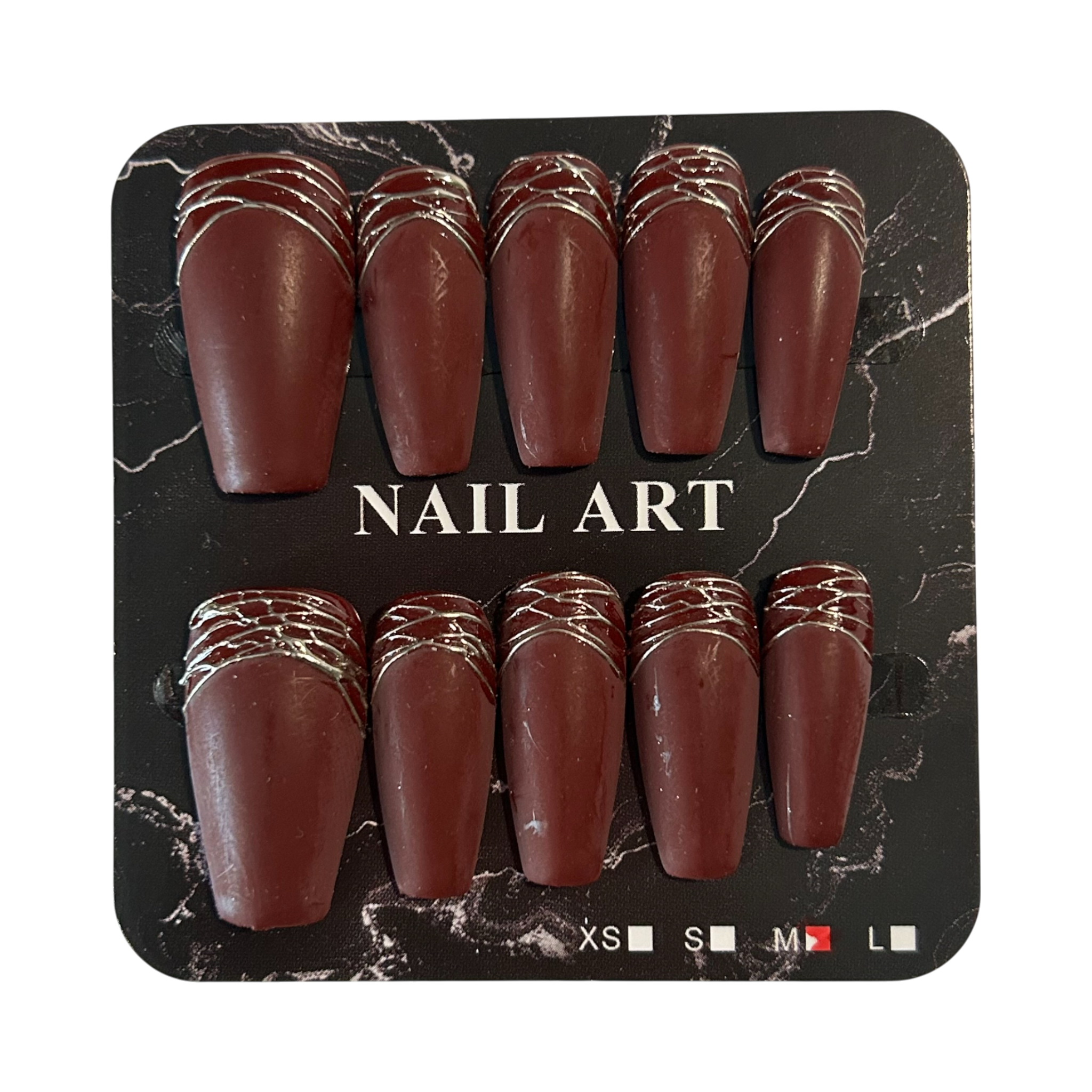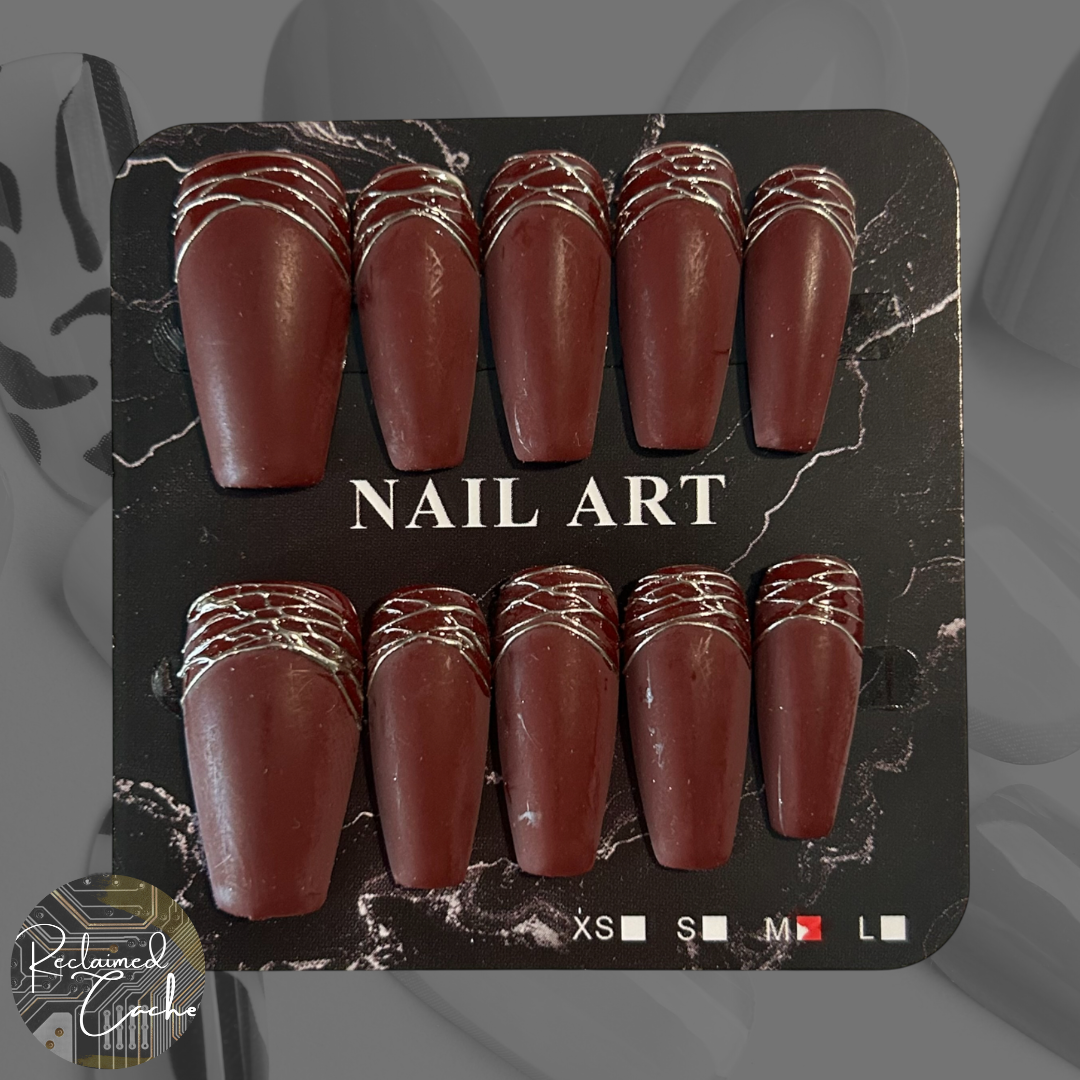 Matte Burgundy and Gold Long Coffin Press On Nails - Size Medium
