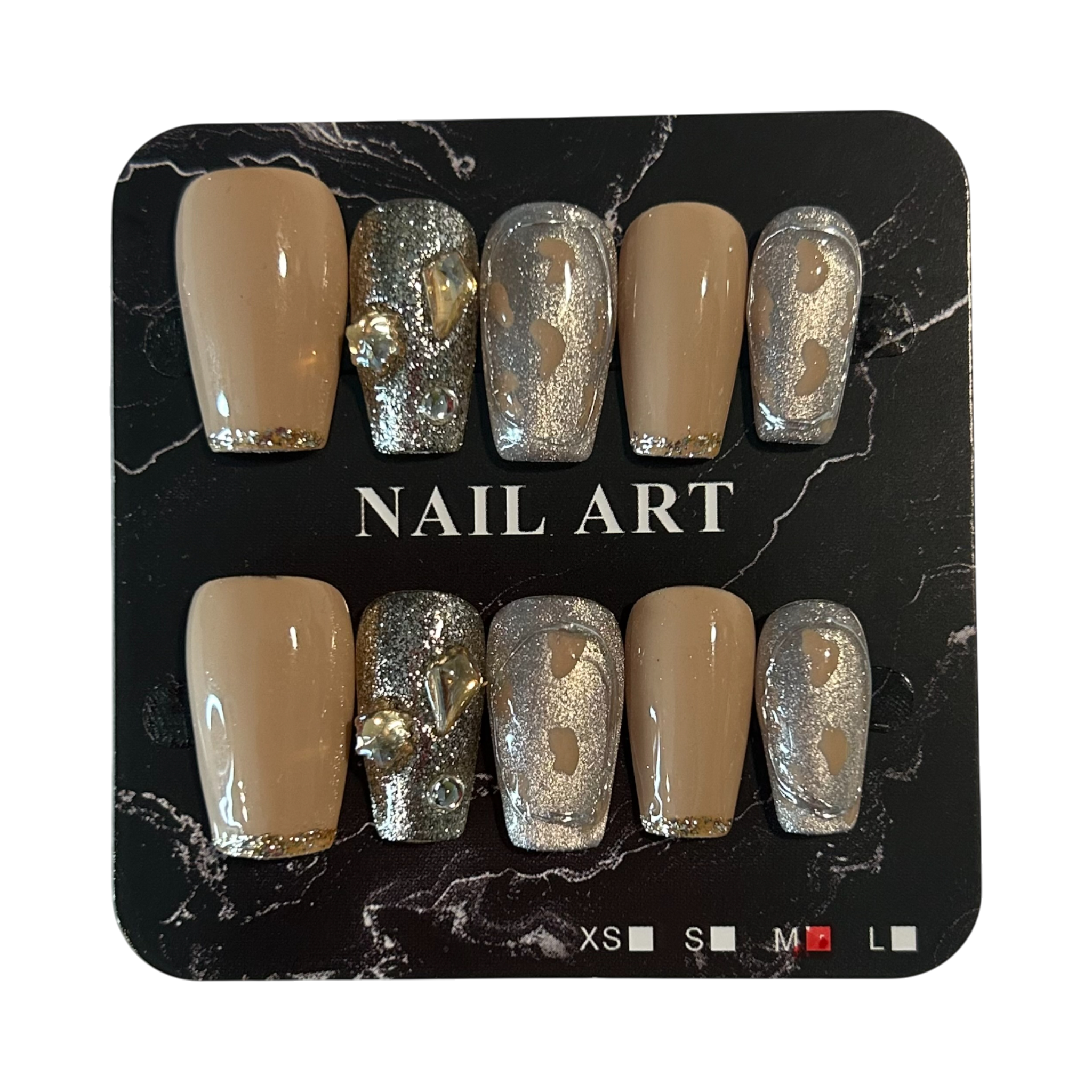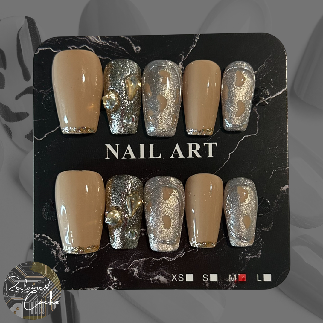 Nude and Gold Glitter Medium Coffin Press On Nails - Size Medium