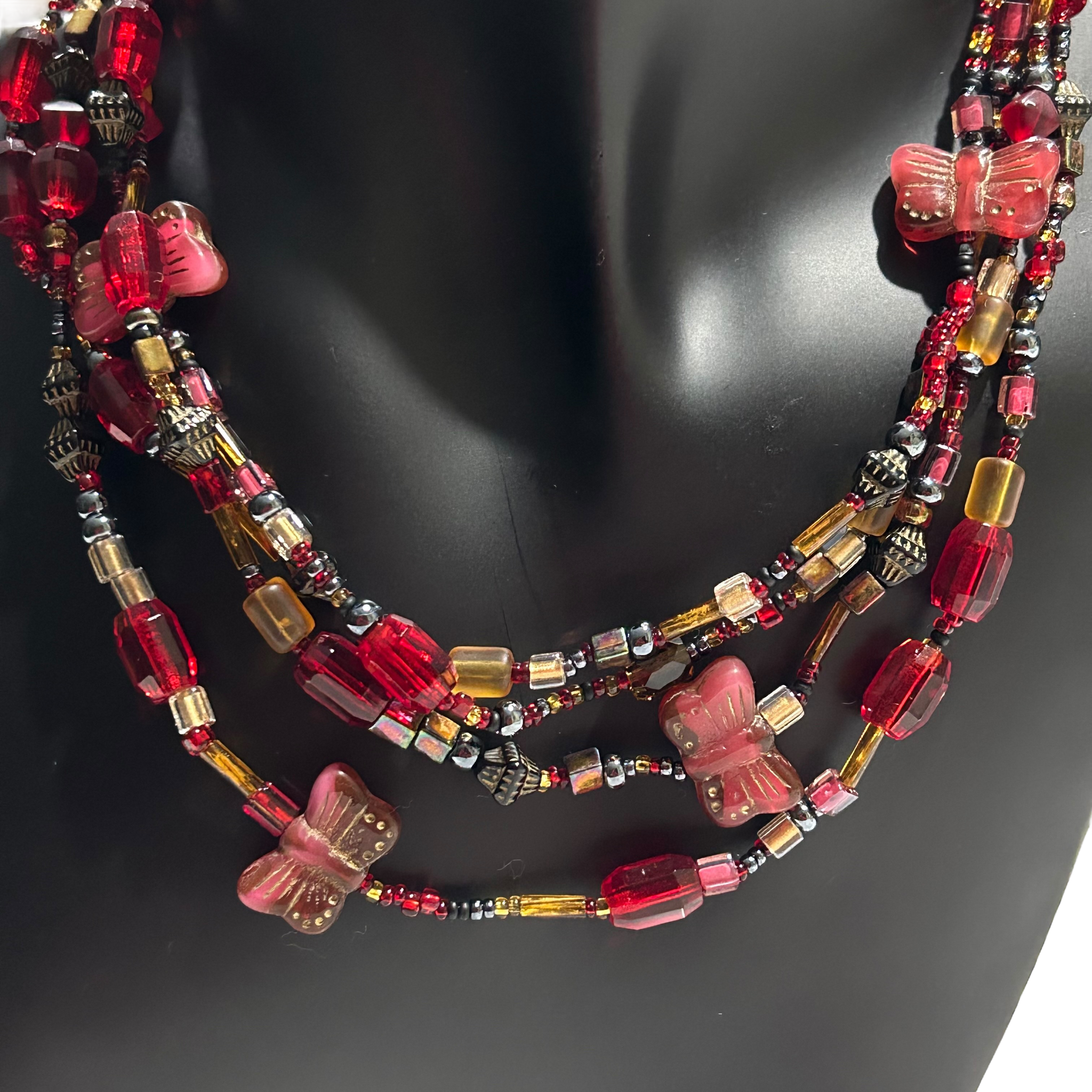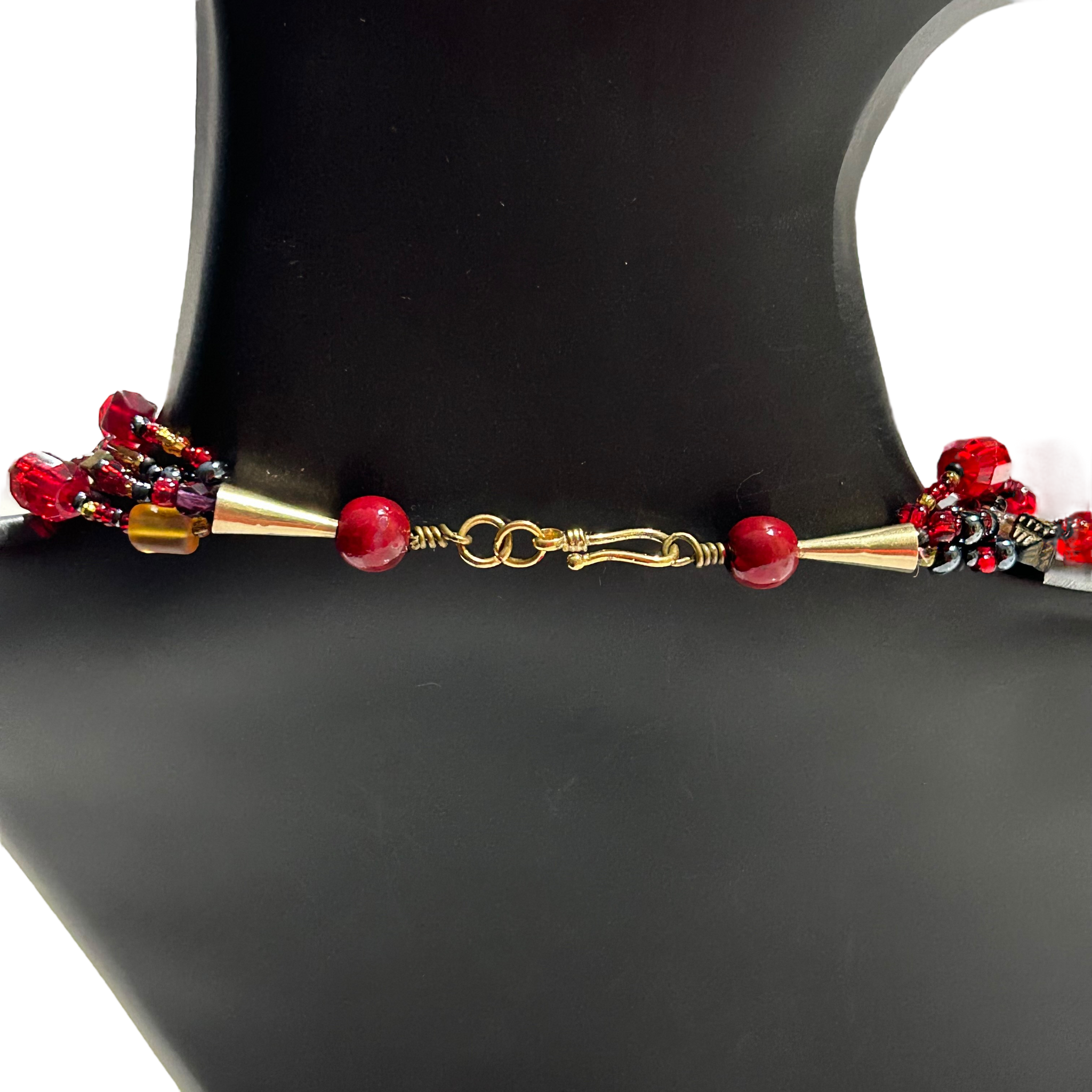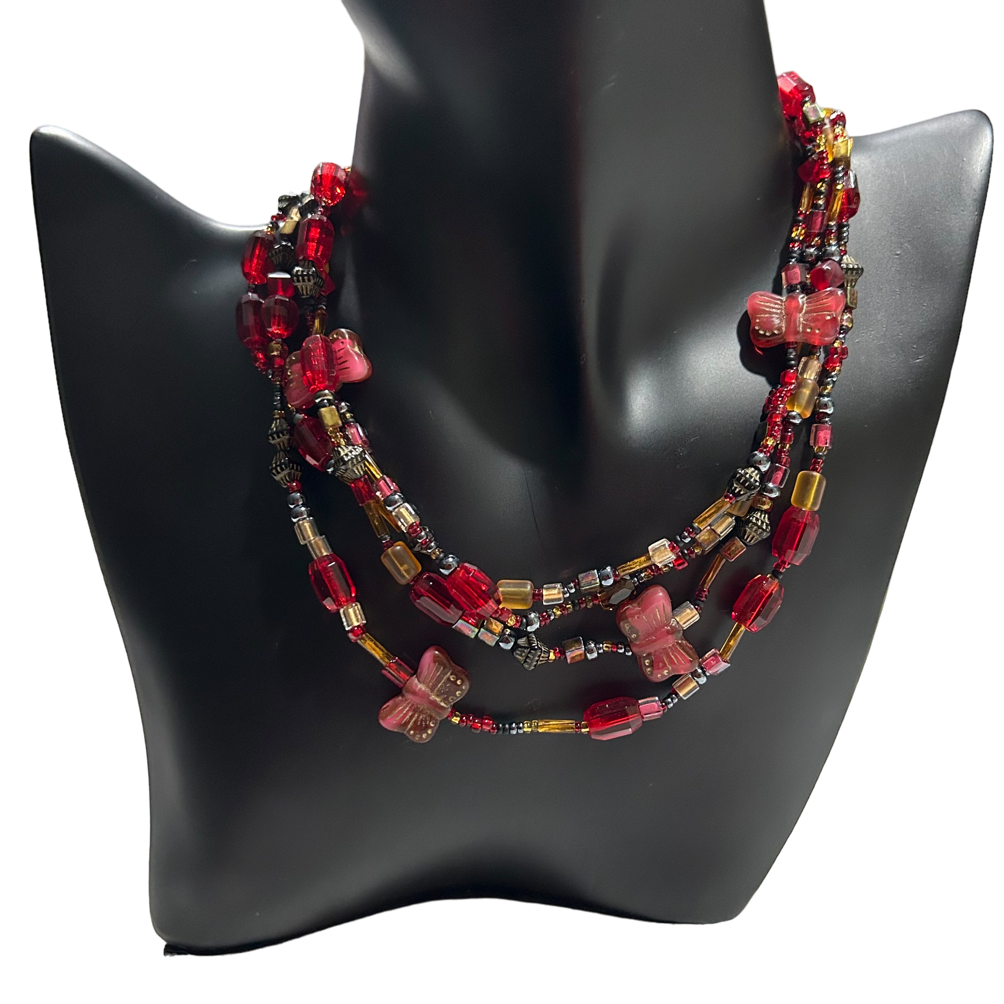 Red and Gold Multi-Strand Glass Bead Layered Necklace