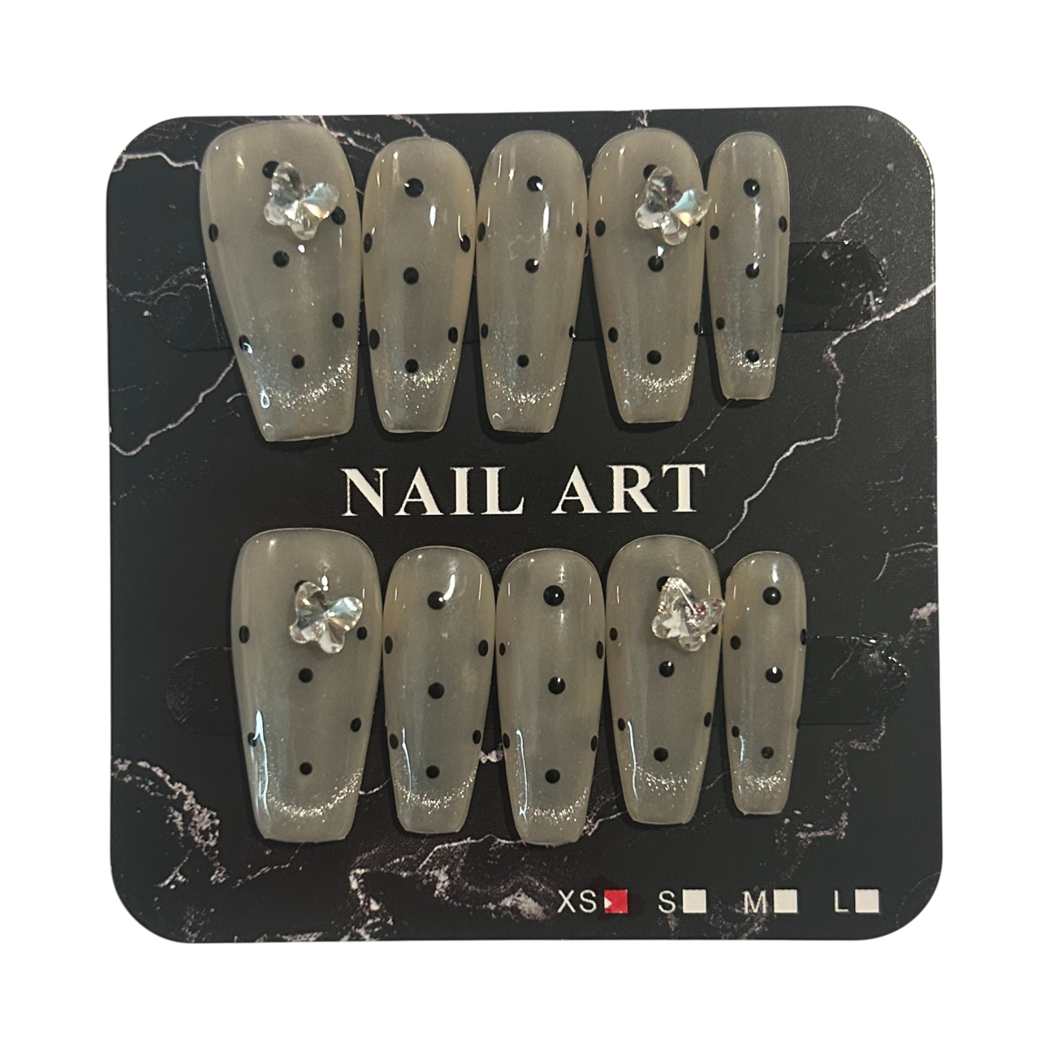 Translucent White and Black Polka Dot Long Coffin Nails - Size Extra Small (XS)